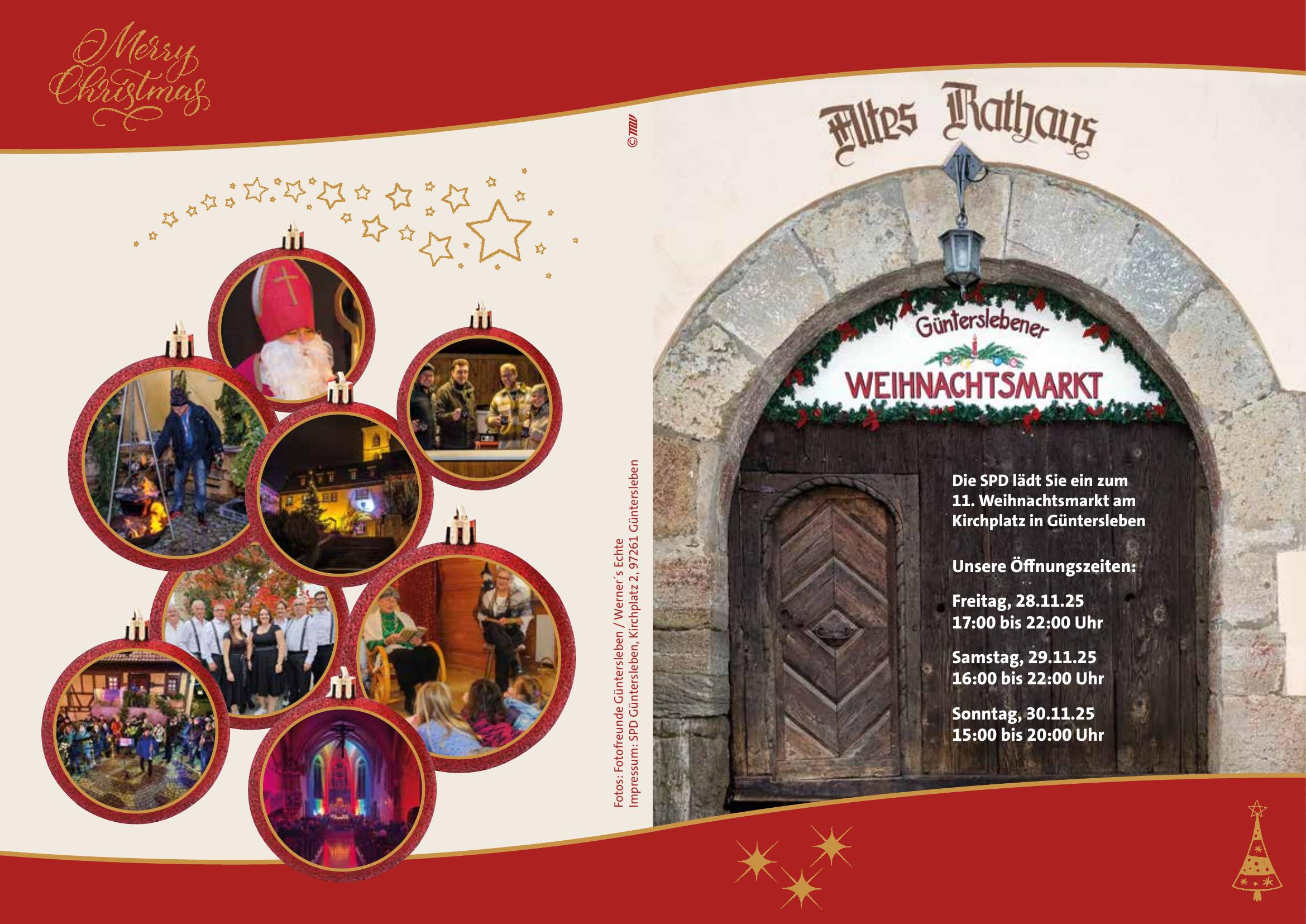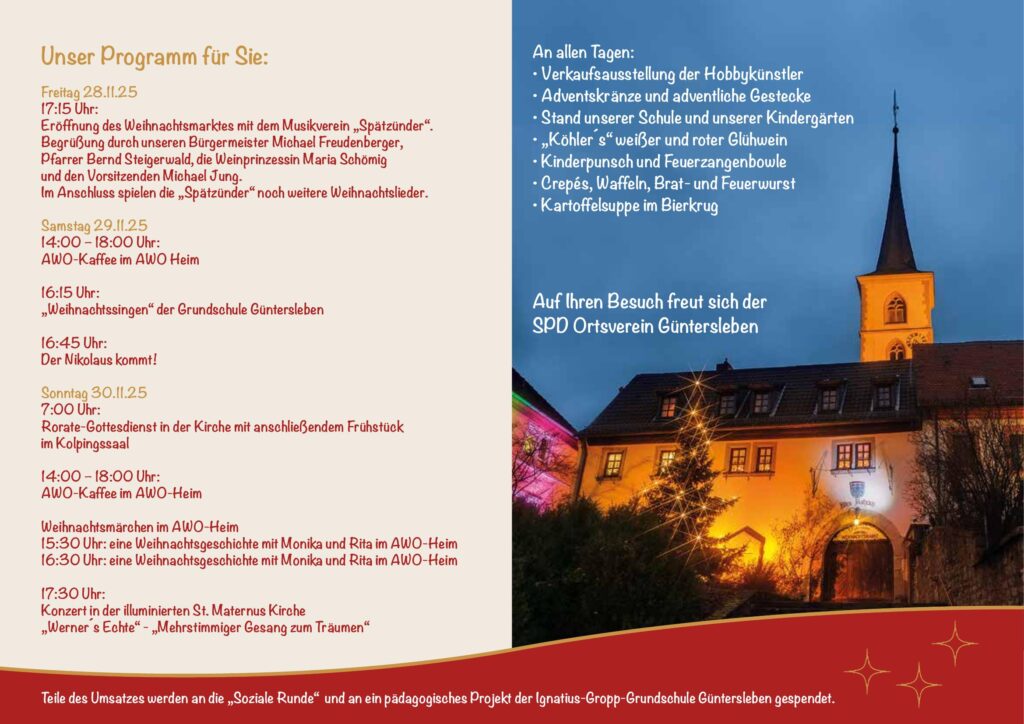 Die SPD Güntersleben lädt herzlich zum 11. Weihnachtsmarkt am Kirchplatz ein! Freuen Sie sich auf ein stimmungsvolles Adventswochenende mit Lichtern, Düften, Musik und Begegnungen mitten im Herzen von Güntersleben.