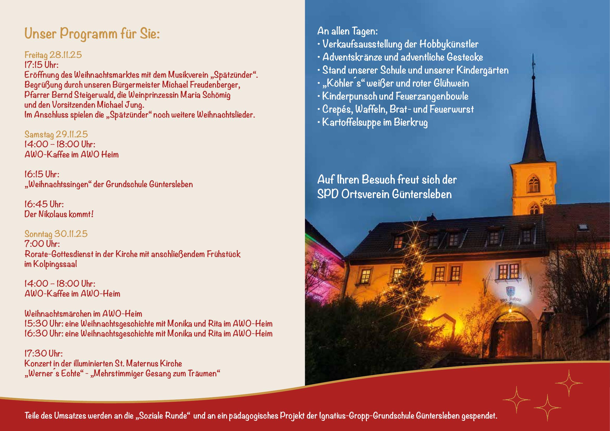 Samstag, 29.11.2025 14:00–18:00 Uhr – AWO-Kaffee im AWO-Heim 16:15 Uhr – Weihnachtssingen der Grundschule Güntersleben 16:45 Uhr – Besuch des Nikolaus 🎅